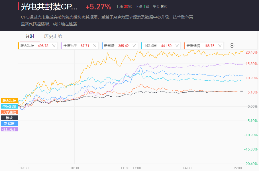 CPO板块全天单边震荡上扬,最终收涨5.27%。