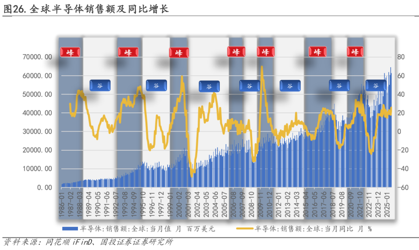 与此同时,全球半导体销售额则呈现出更短频的波动,以2–3年为一个小周期,这主要由产品迭代与技术创新驱动。