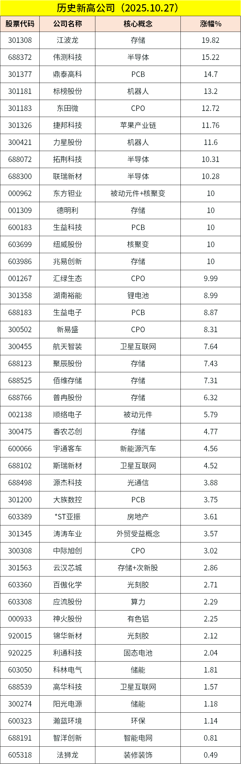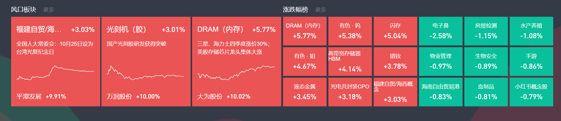 除上述热点外,光模块、存储、PCB板、机器人等表现不俗;跌幅方面,医药、储能等跌幅居前。