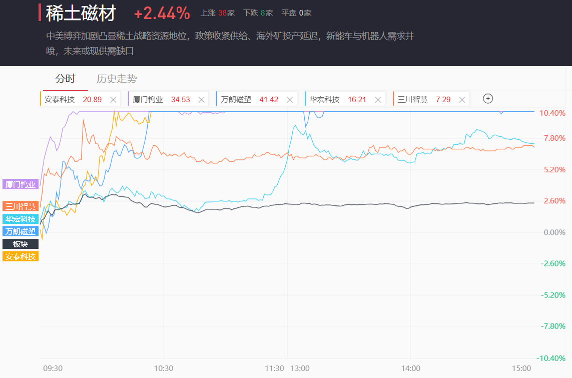 稀土板块早盘一度张超3.2%,此后小幅回落震荡,最终收涨2.44%。
