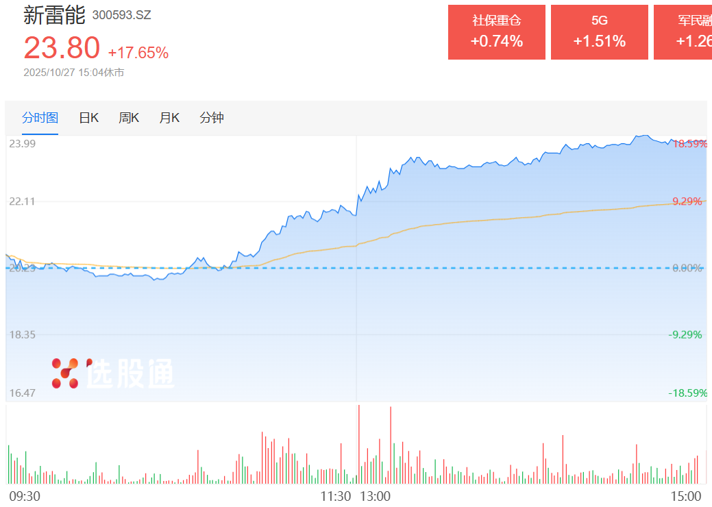 上午收盘前,新雷能板块开始小幅放量走强,午后持续震荡走强,最终收涨近18%。