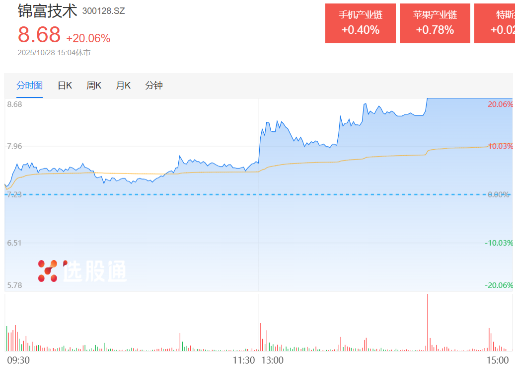 午后,锦富技术迎来爆拉,高位盘整过后在媒体发布消息的助攻下拿下涨停。