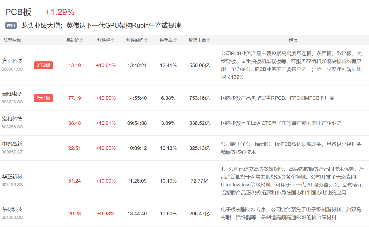 PCB板今日再度大涨,景旺电子2连板,方正科技、中钨高新等多股涨停。