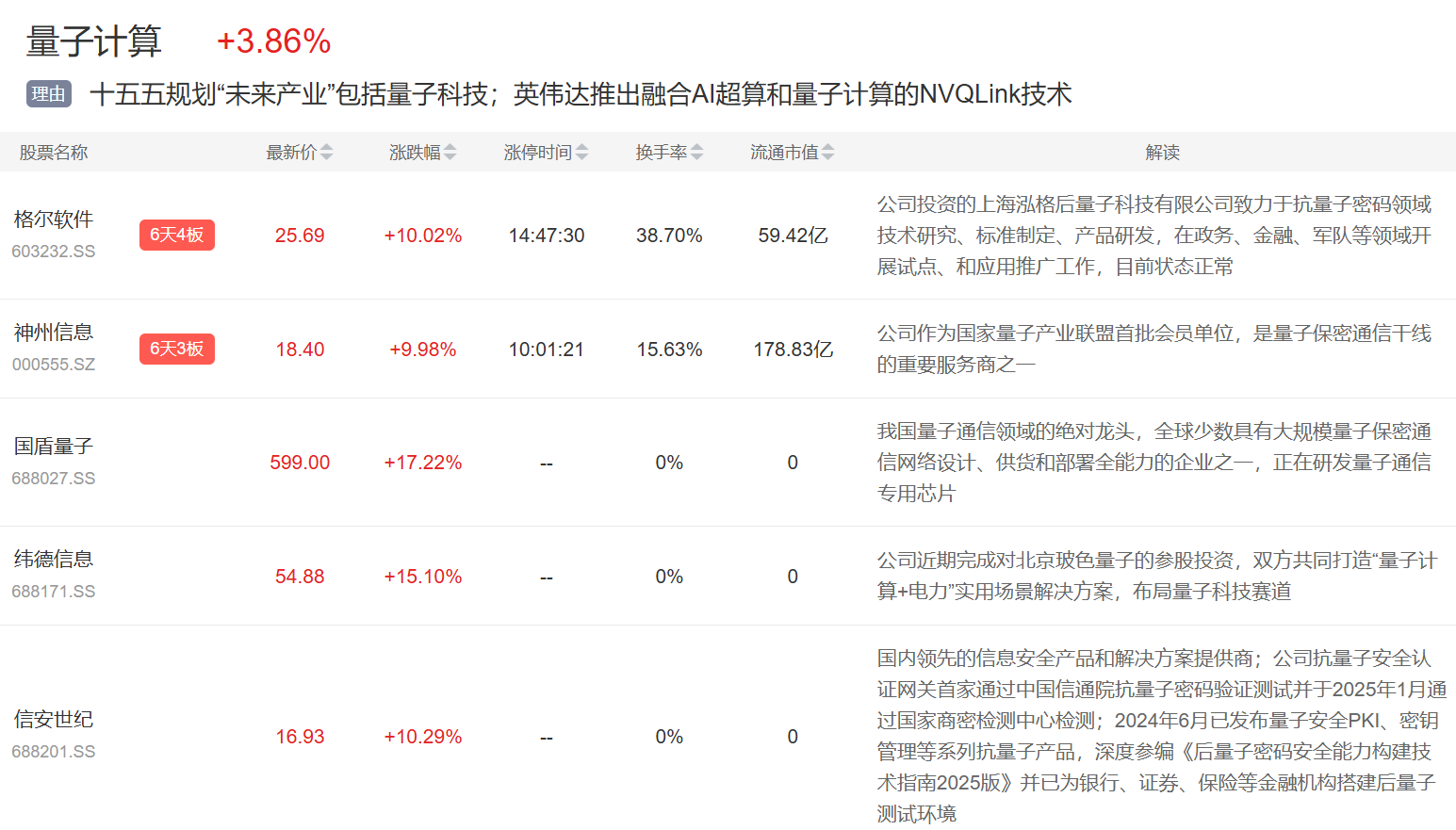 量子计算概念今日再度活跃,格尔软件、神州信息等涨停,国盾量子、禾信仪器等大涨超10%。