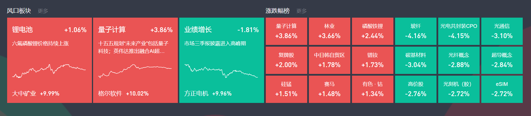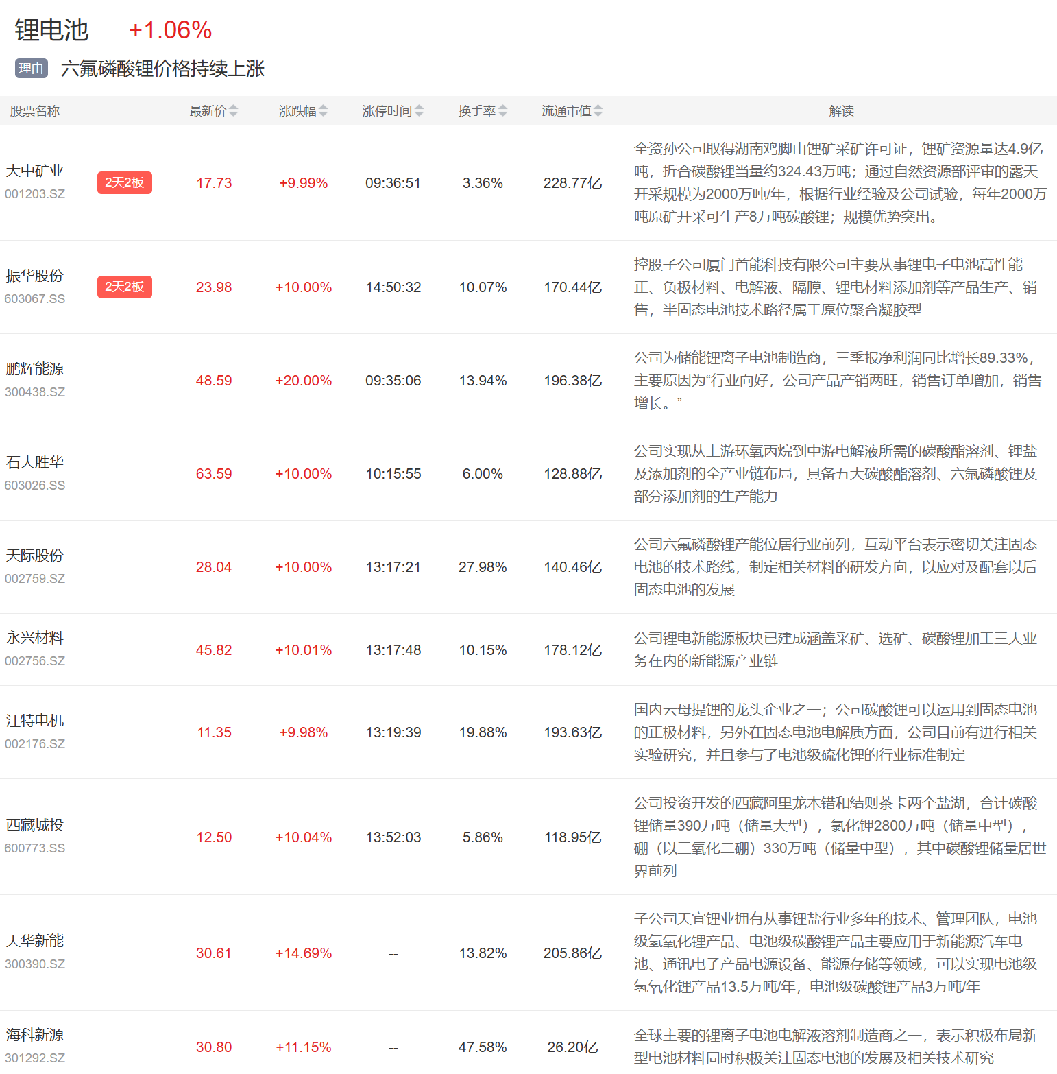 锂电池概念今日大涨,大中矿业、振华股份2连板,鹏辉能源、石大胜华、天际股份等涨停。