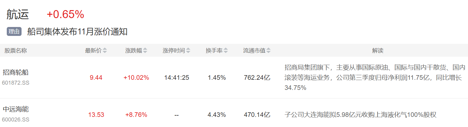 航运板块大涨,招商轮船等涨停,中远海特触板,招商南油、中远海特等跟涨。