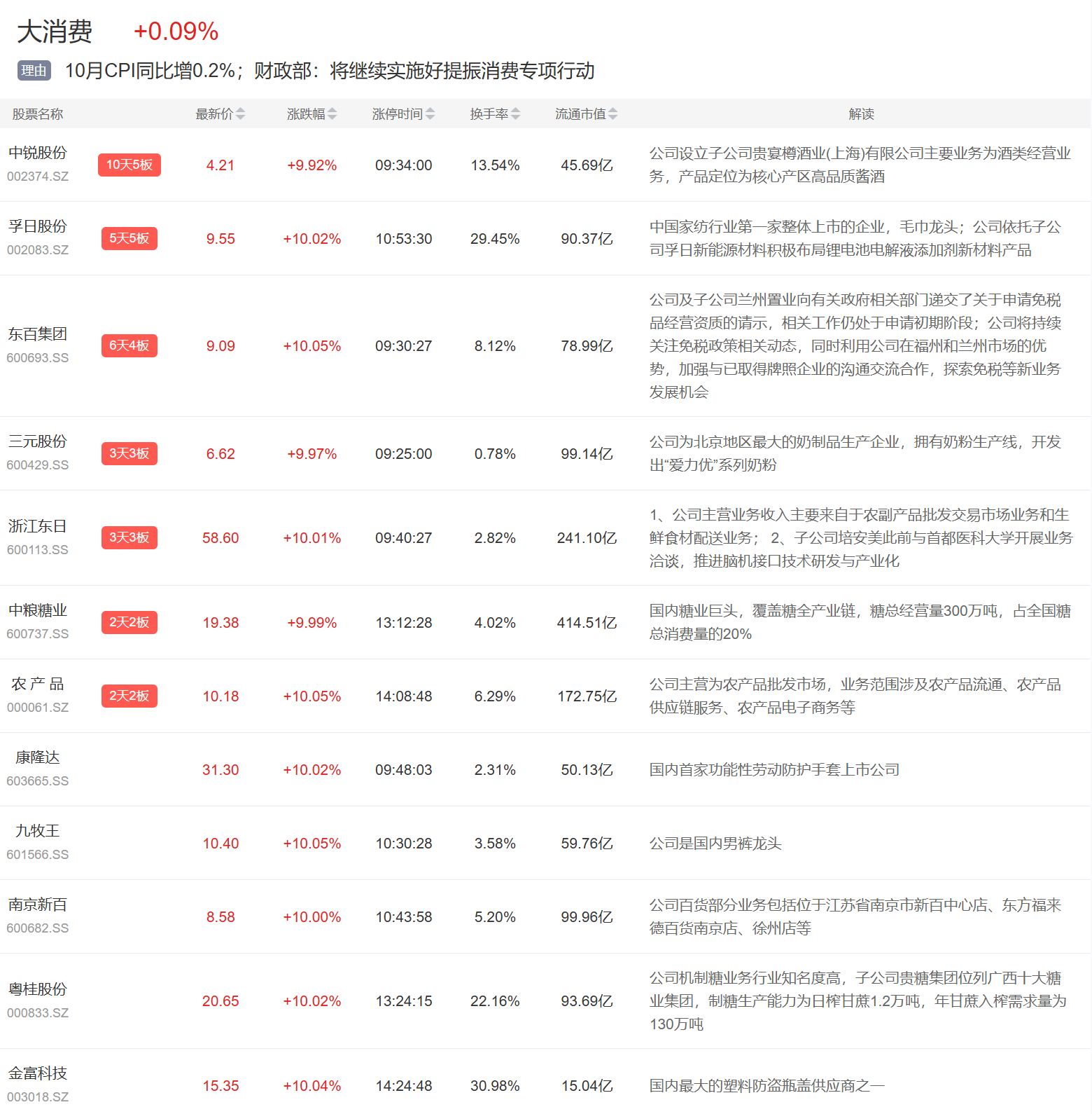 大消费板块今日继续活跃,中锐股份、东百集团、三元股份等3连板,中粮糖业、农产品等2连板。