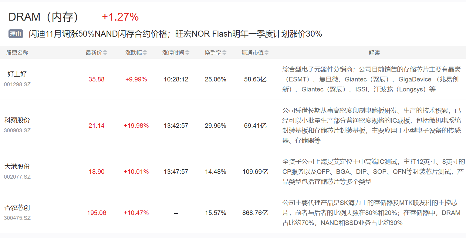 此外,据界面新闻11月12日报道,存储厂旺宏订单满手,将在明年第一季度调涨NOR Flash报价,涨幅上看三成