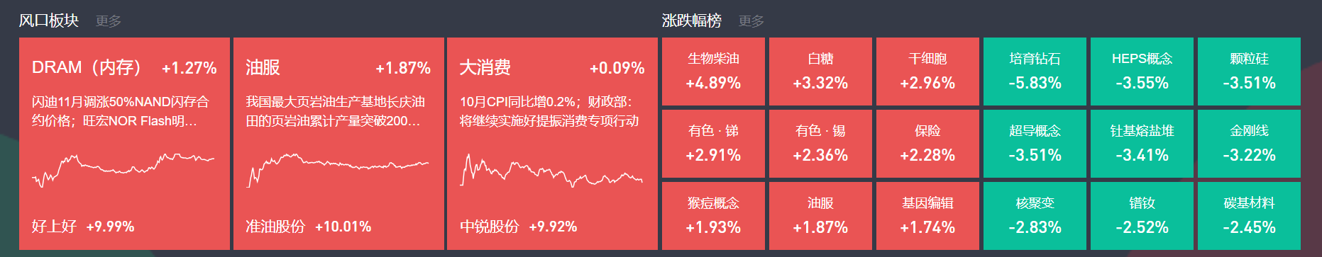 除上述热点外,医药、有色铝、卫星互联网等均有表现;跌幅方面,光伏、储能等跌幅居前。