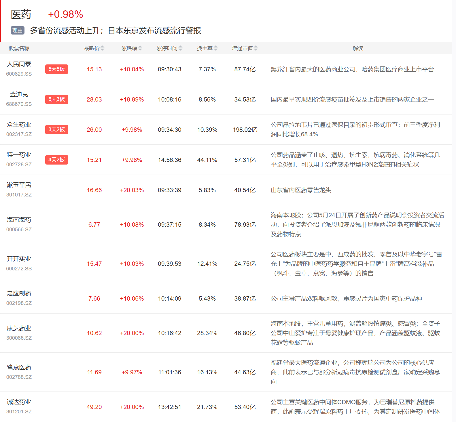 医药板块今日大涨,人民同泰5连板,金迪克、众生药业、特一药业等涨停。