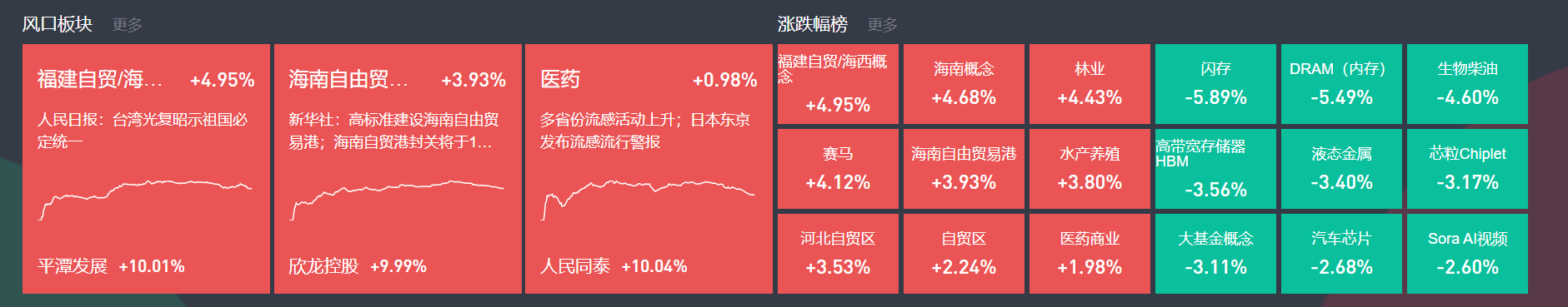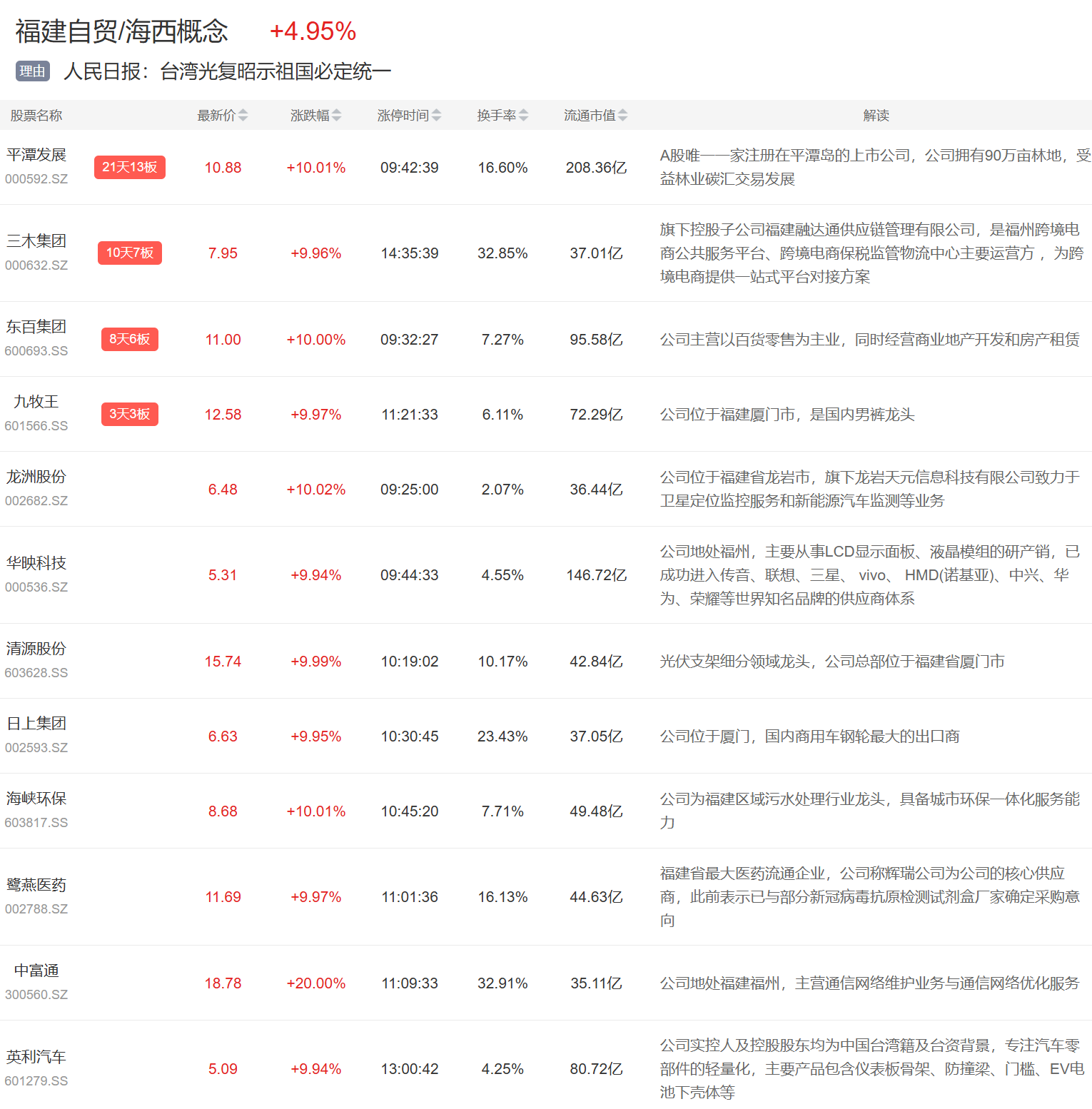 福建自贸概念今日继续大涨,平潭发展再度涨停,三木集团6连板,东百集团5连板,九牧王3连板,龙洲股份、海峡环保等涨停。