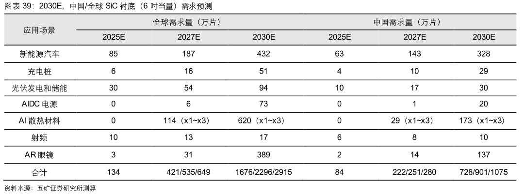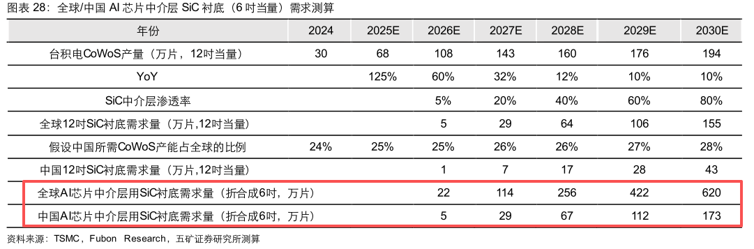 同时,SiC作为先进封装散热材料,解决GPU高发热难题,2030年全球AI芯片中介层所需衬底需求约620万片,中国173万片;若在现有技术路径下,CoWoS工艺中,基板和热沉材料也采用SiC,则AI芯片散热领域衬底空间将增加2倍。