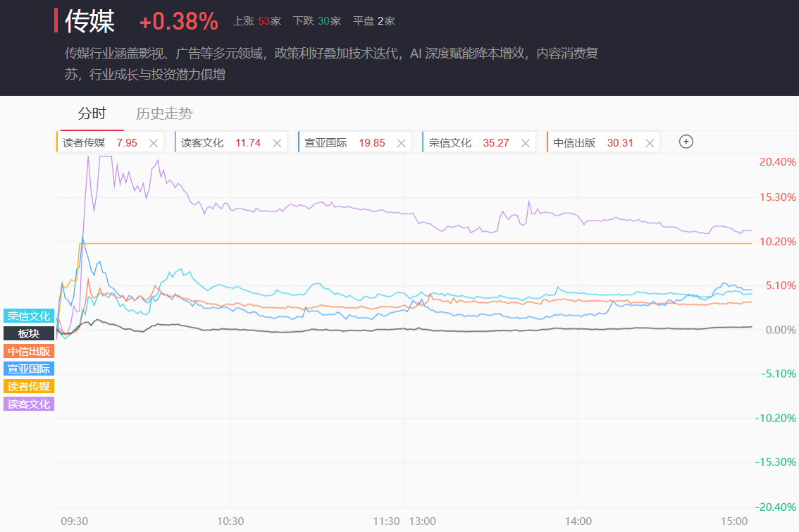 传媒板块早盘水下急拉,一度涨超1%,但此后回落收涨0.38%。