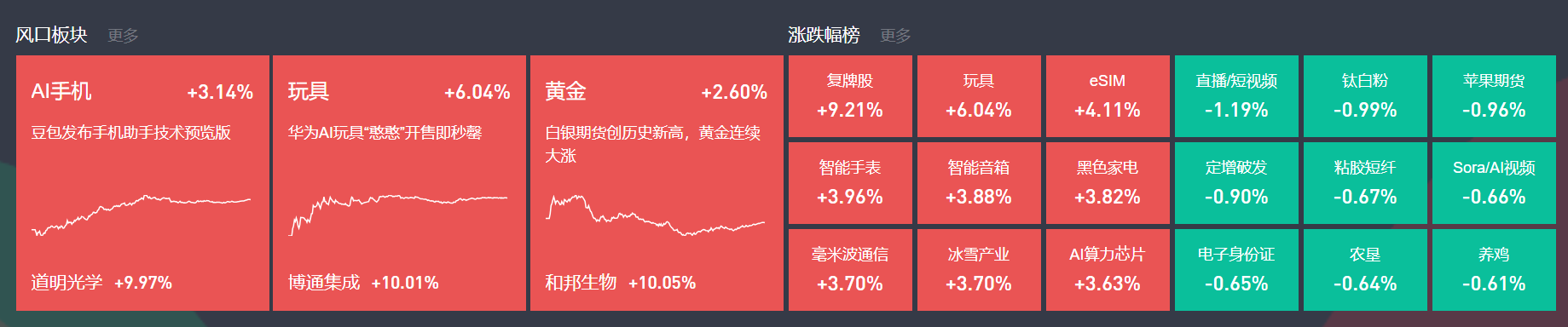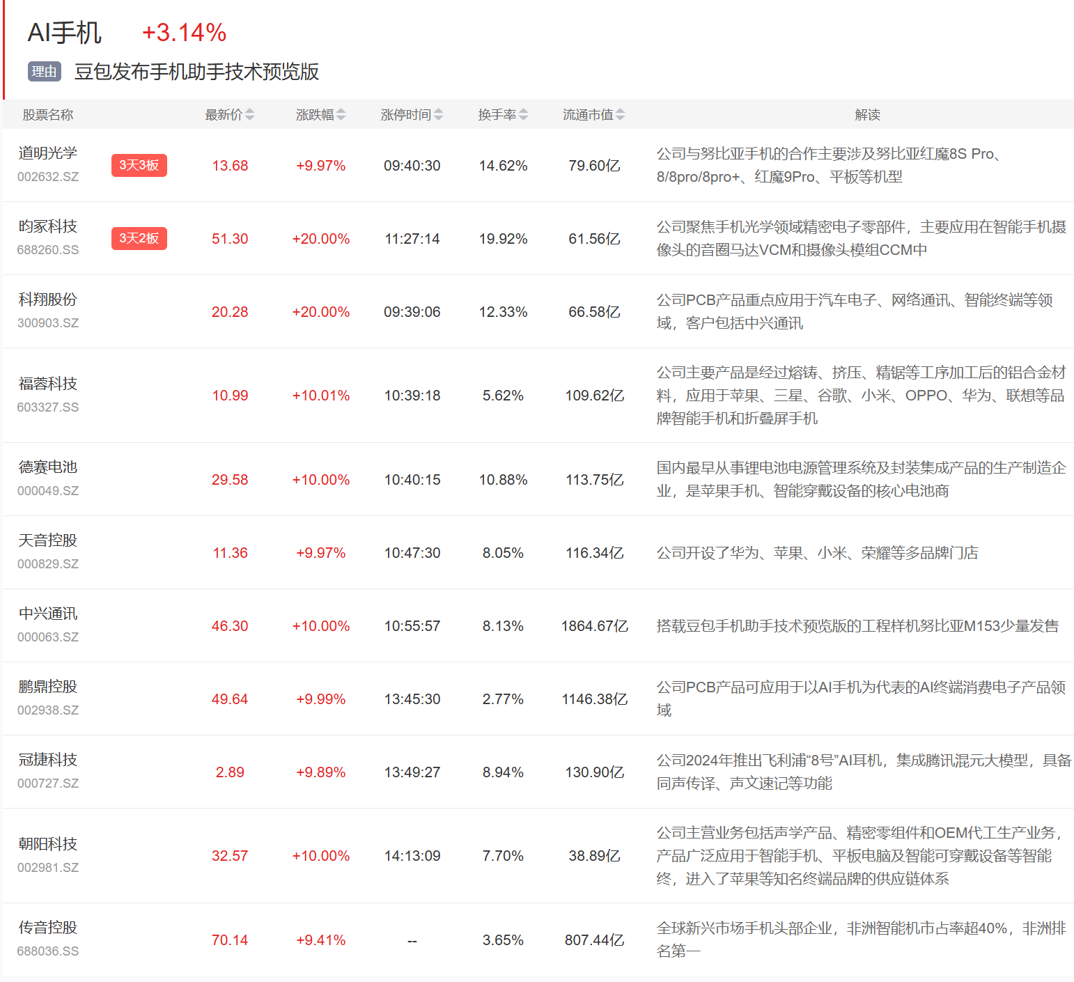 AI手机今日大涨,道明光学3连板,昀冢科技、福蓉科技等涨停,大盘中兴通讯也录得涨停。