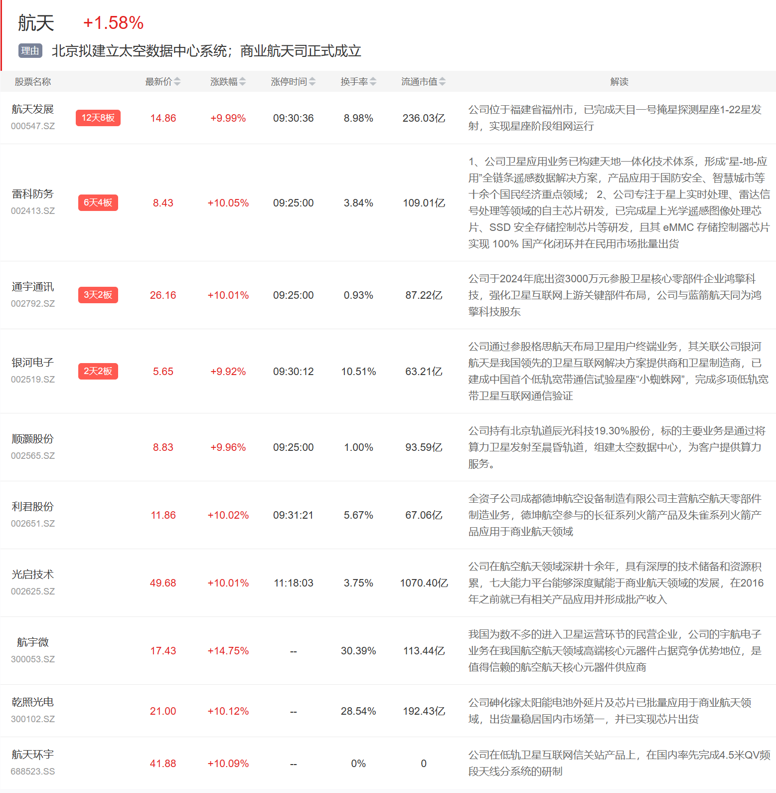 航天板块今日继续活跃,通宇通讯、顺灏股份等一字涨停,航天发展、银河电子等涨停。
