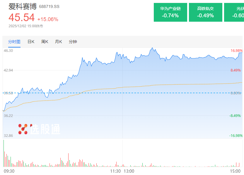 不过昨日大跌的爱科赛博今日低开6.5%,全天单边震荡走强,最终大幅收涨15%。