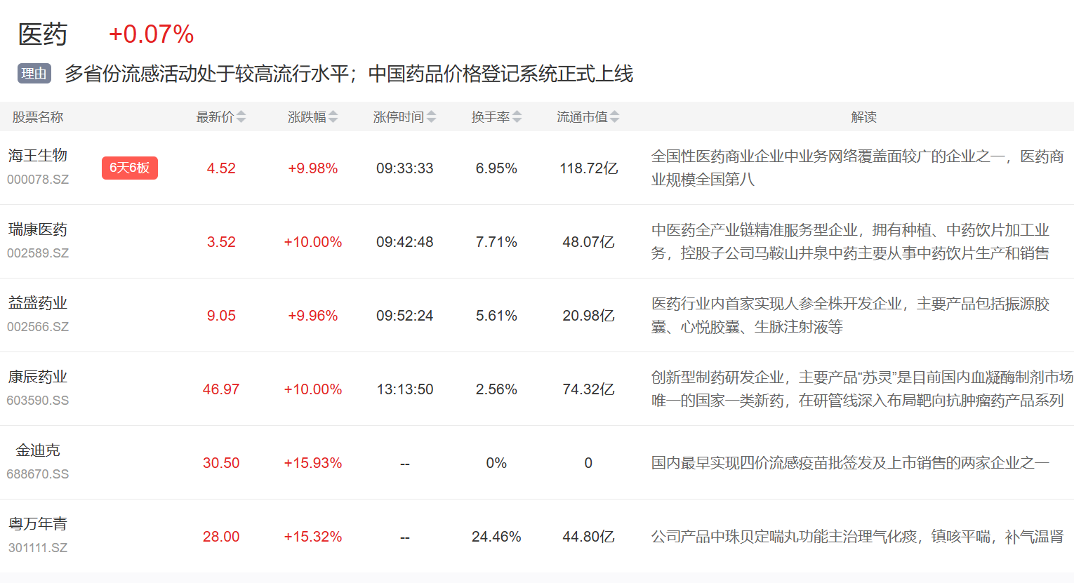 医药板块今日再度活跃,海王生物6连板,瑞康医药、益盛药业等涨停。
