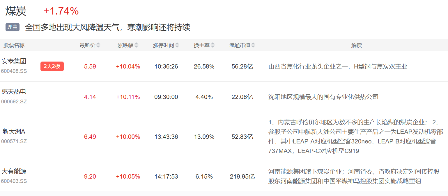 煤炭板块今日表现,安泰集团2连板,惠天热电、新大洲A等涨停。