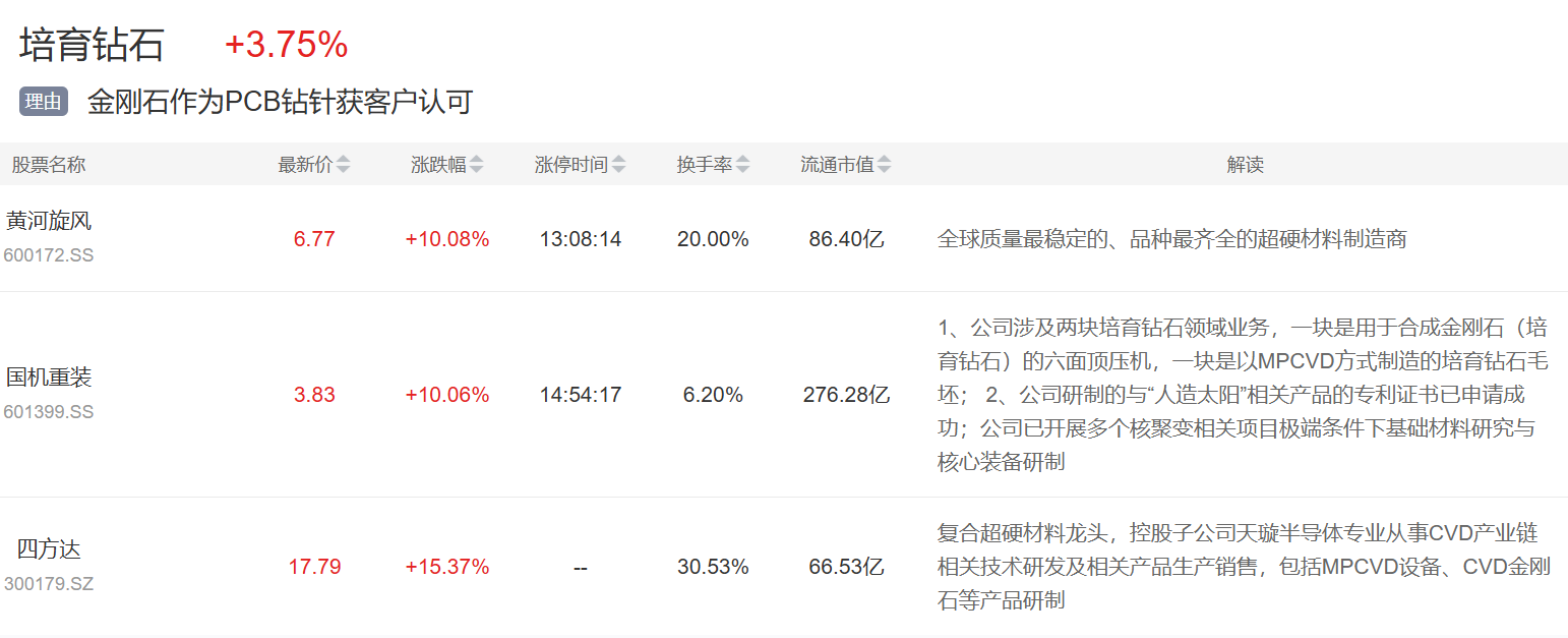 培育钻石板块今日大涨,黄河旋风、国机重装等涨停,四方达大涨15%。