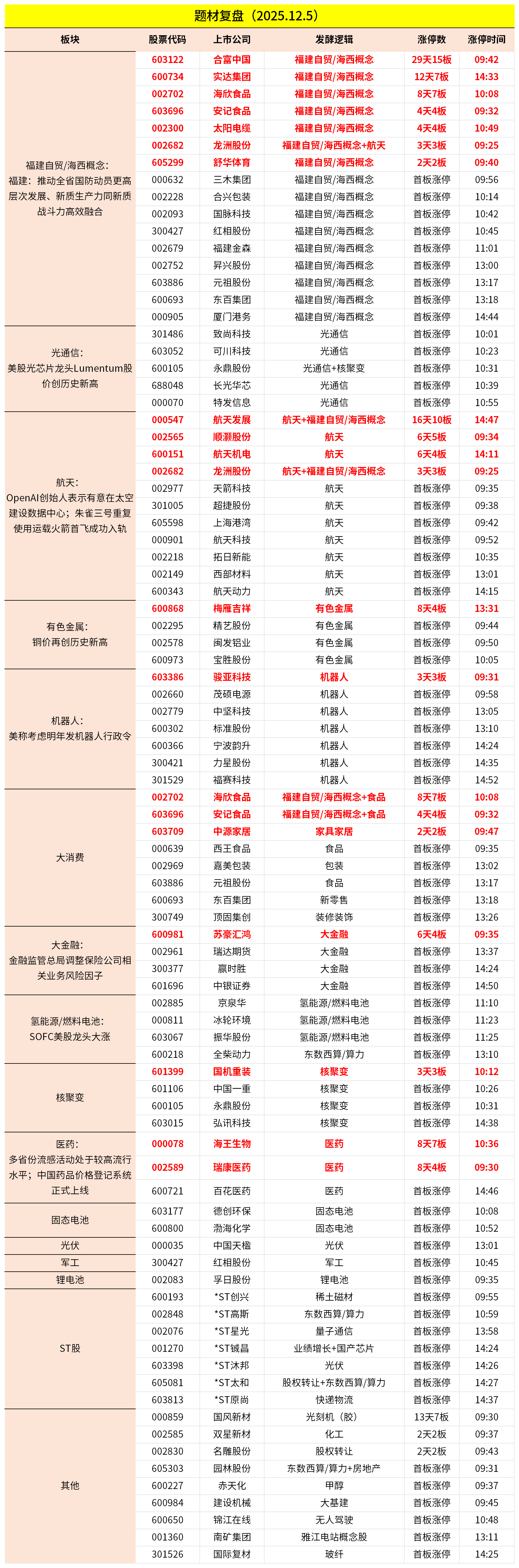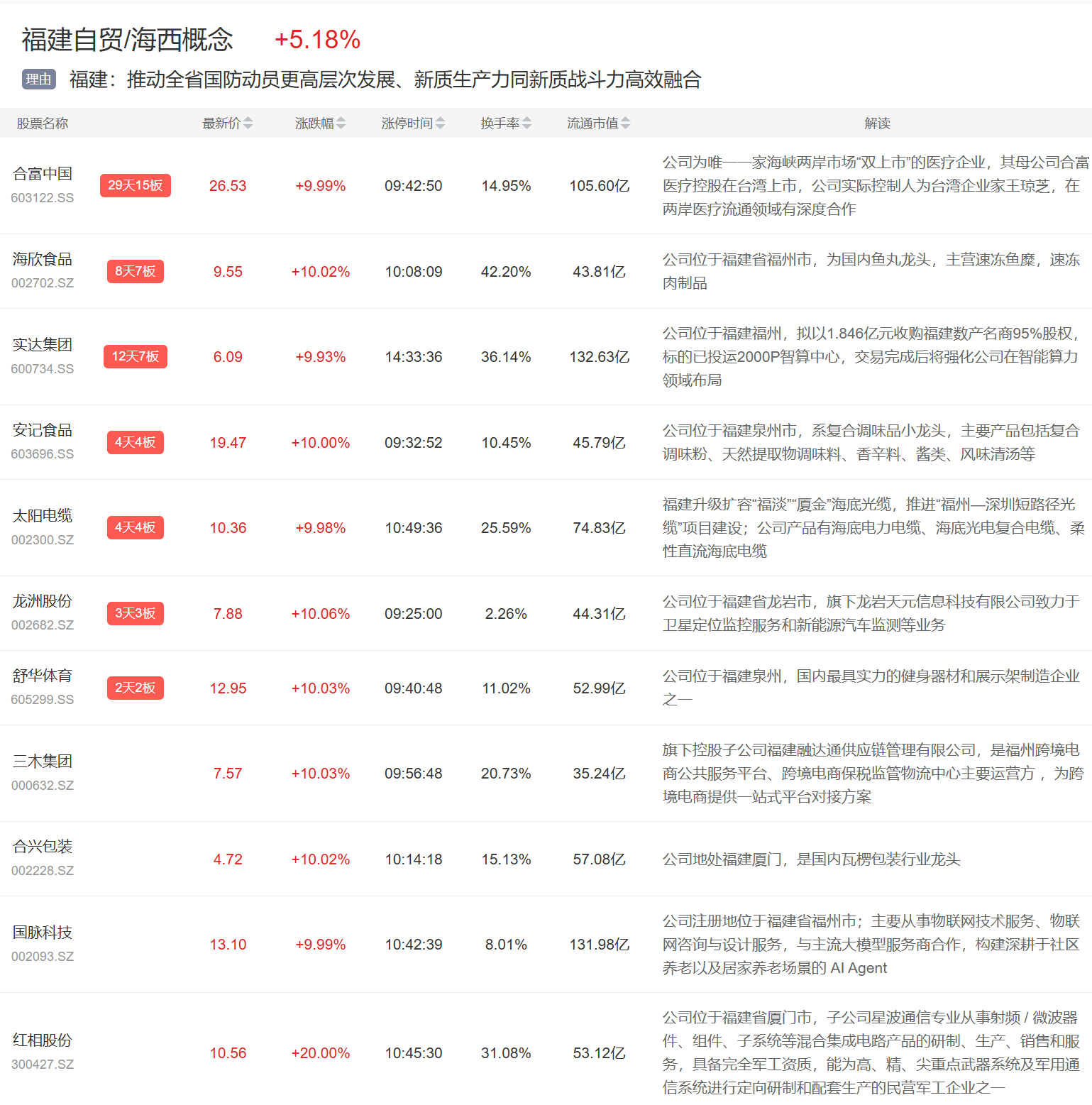 福建自贸今日继续活跃,合富中国再度涨停,海欣食品反包,安记食品4连板,龙洲股份3连板。