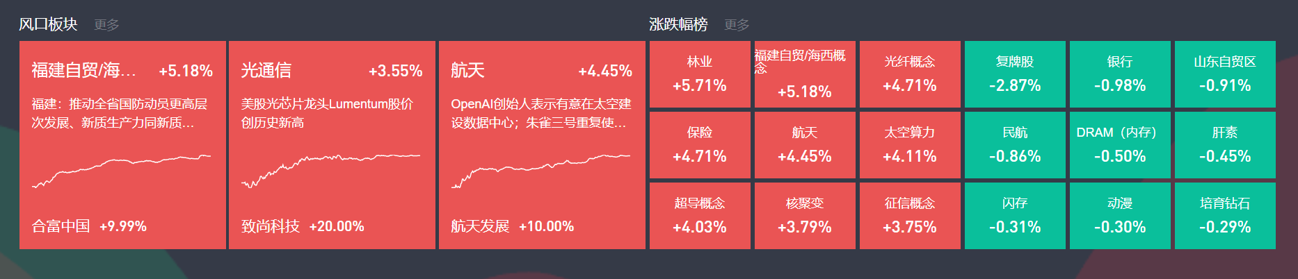 沪指全天低开高走,深成指、创业板指涨超1%。大金融板块午后爆发,中银证券、瑞达期货等涨停,中国太保涨近7%。商业航天概念延续强势,超捷股份、航天动力等十余股涨停。福建板块反复活跃,福建金森、厦门港务等近20股涨停。下跌方面,摩尔线程概念股调整,和而泰跌停,大众公用接近跌停。个股涨多跌少,沪深京三市近4400股飘红,今日成交1.74万亿。