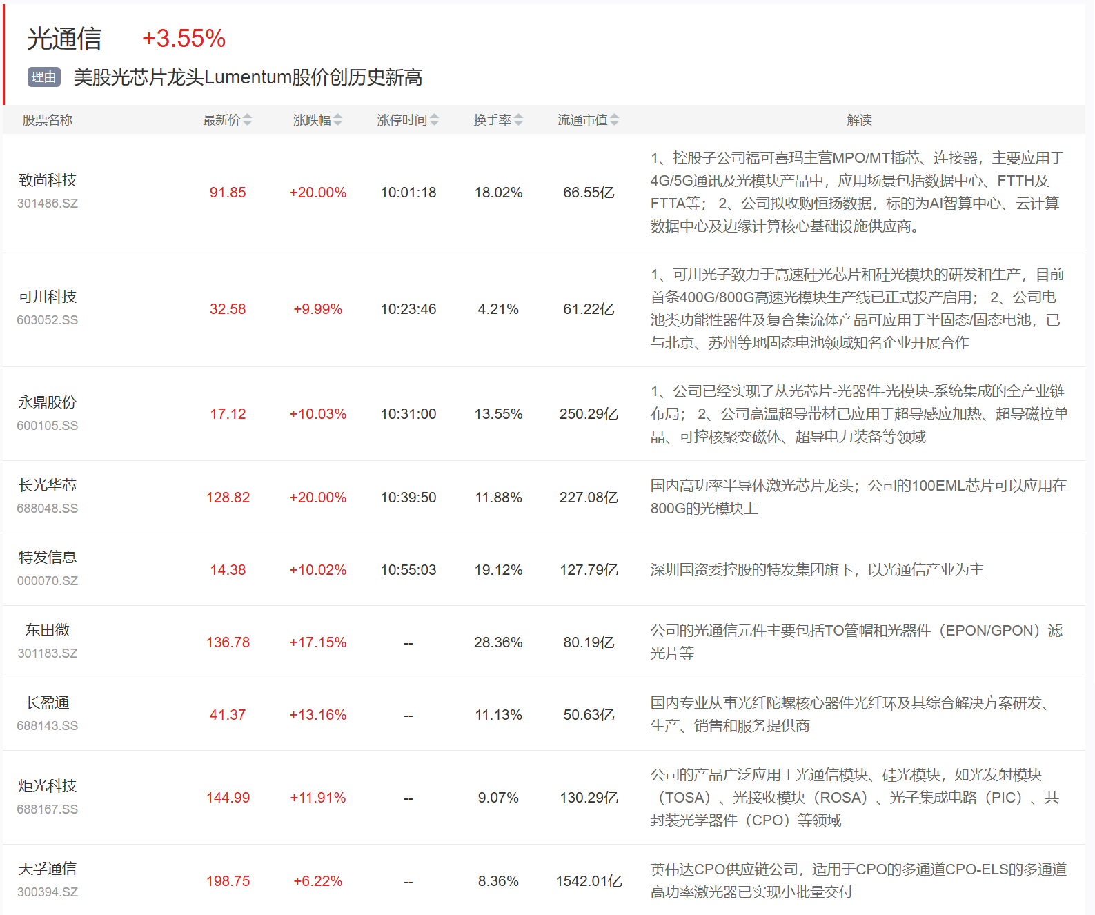 光通信概念今日强势,致尚科技、可川科技、永鼎股份、长光华芯等涨停。
