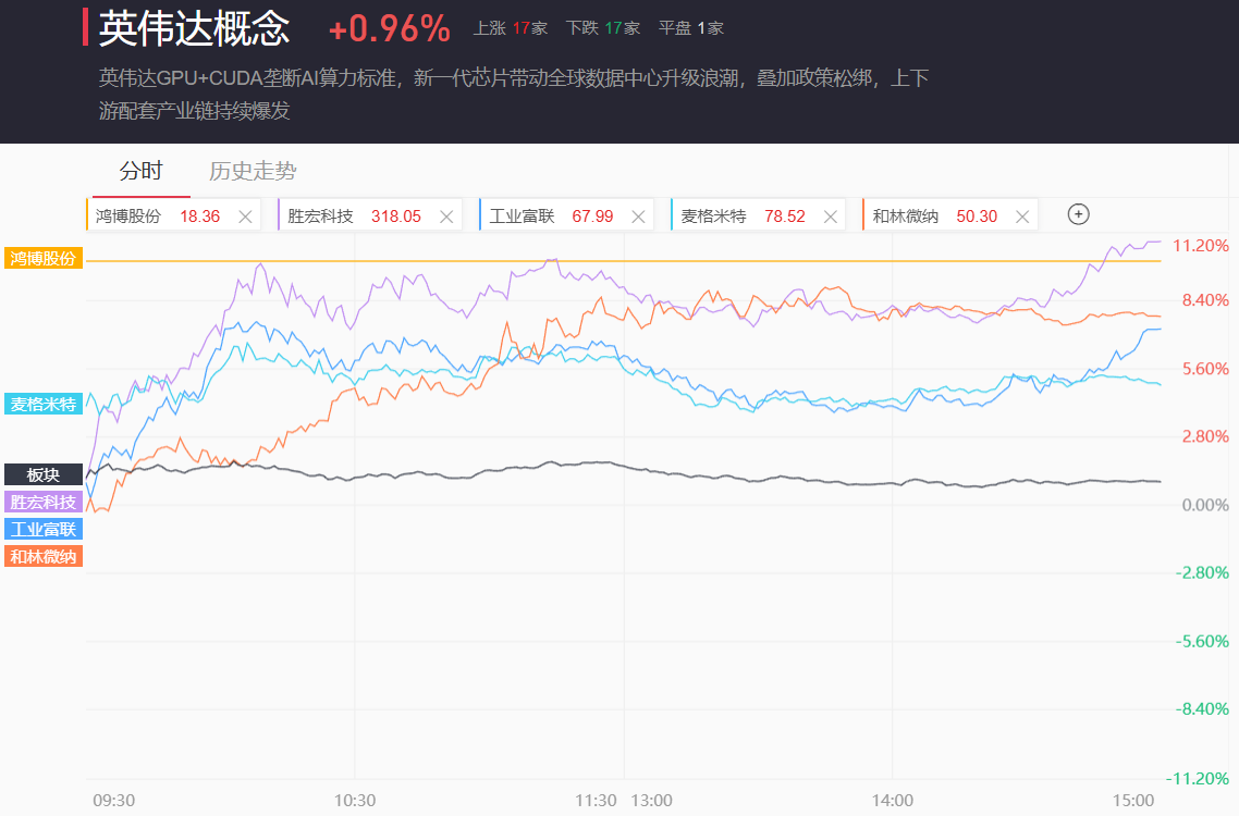 题材方面,英伟达概念整体小幅高开低走,鸿博股份一字板,浪潮信息、中电港、麦格米特等集体高开,胜宏科技、和林微纳、工业富联、景旺电子等盘中集体大涨;
