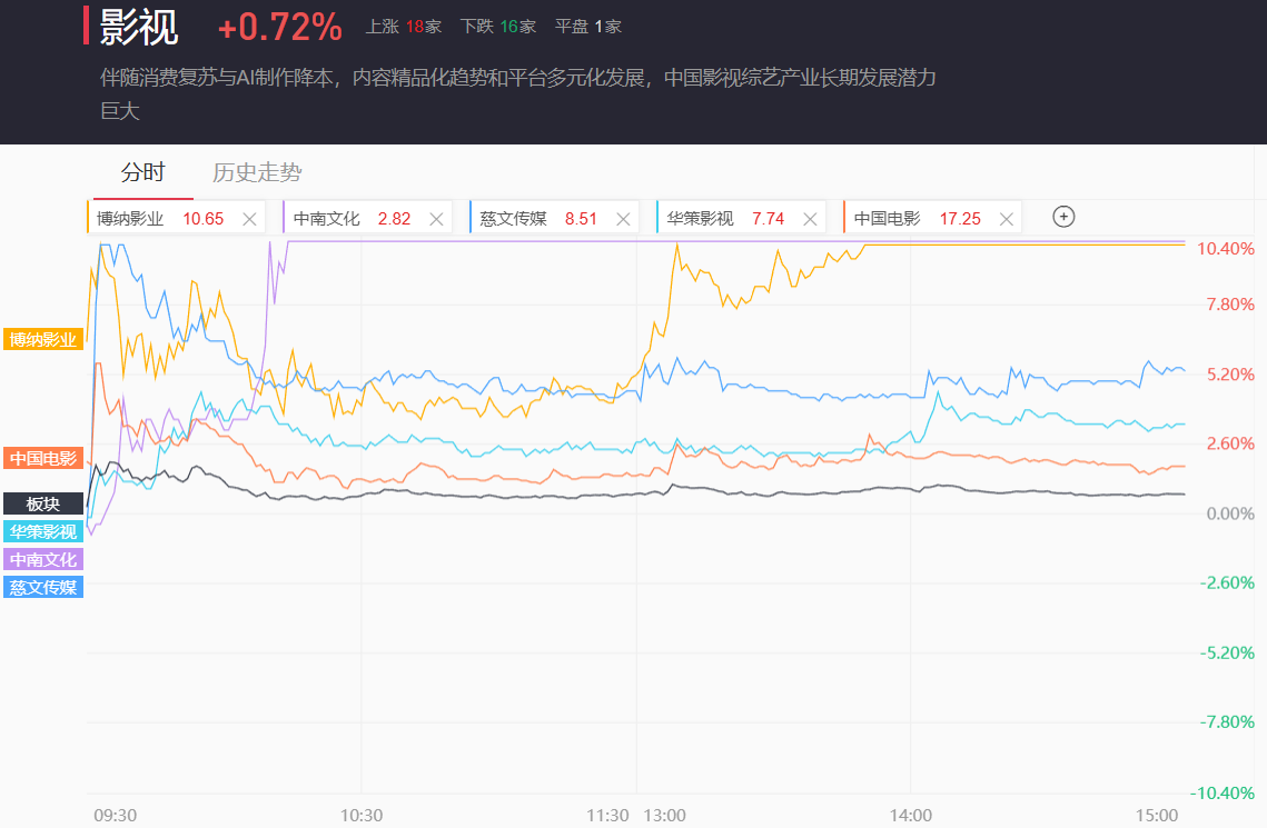 影视板块迎来短暂冲高,博纳影业2连板,中南文化涨停,慈文传媒、华策影视、中国电影 欢瑞世纪等集体冲高;
