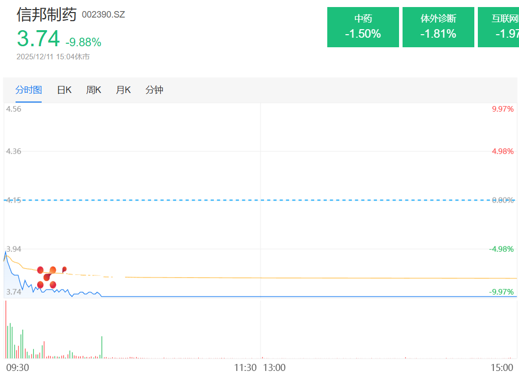 开盘后信邦制药单边震荡下跌,上午封死跌停板。