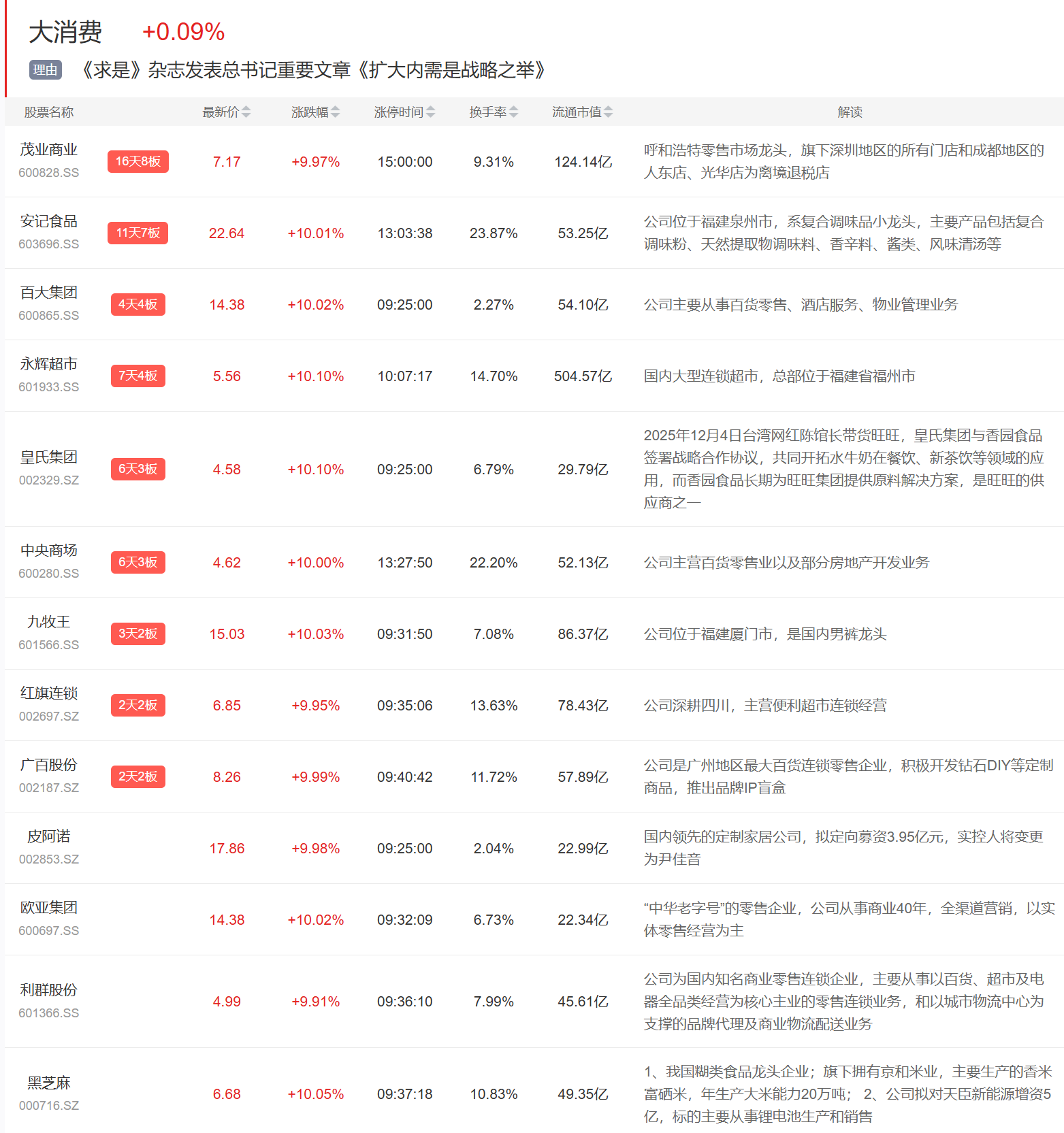 大消费板块今日继续活跃,百大集团4连板,茂业商业、安记食品、永辉超市等多股反包。