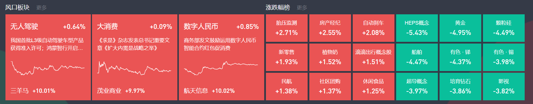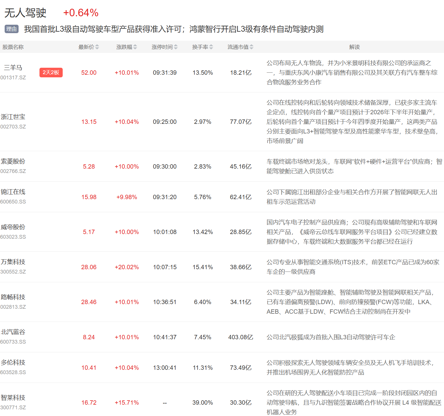 无人驾驶板块今日大涨,三羊马2连板,浙江世宝、索菱股份等多股涨停。