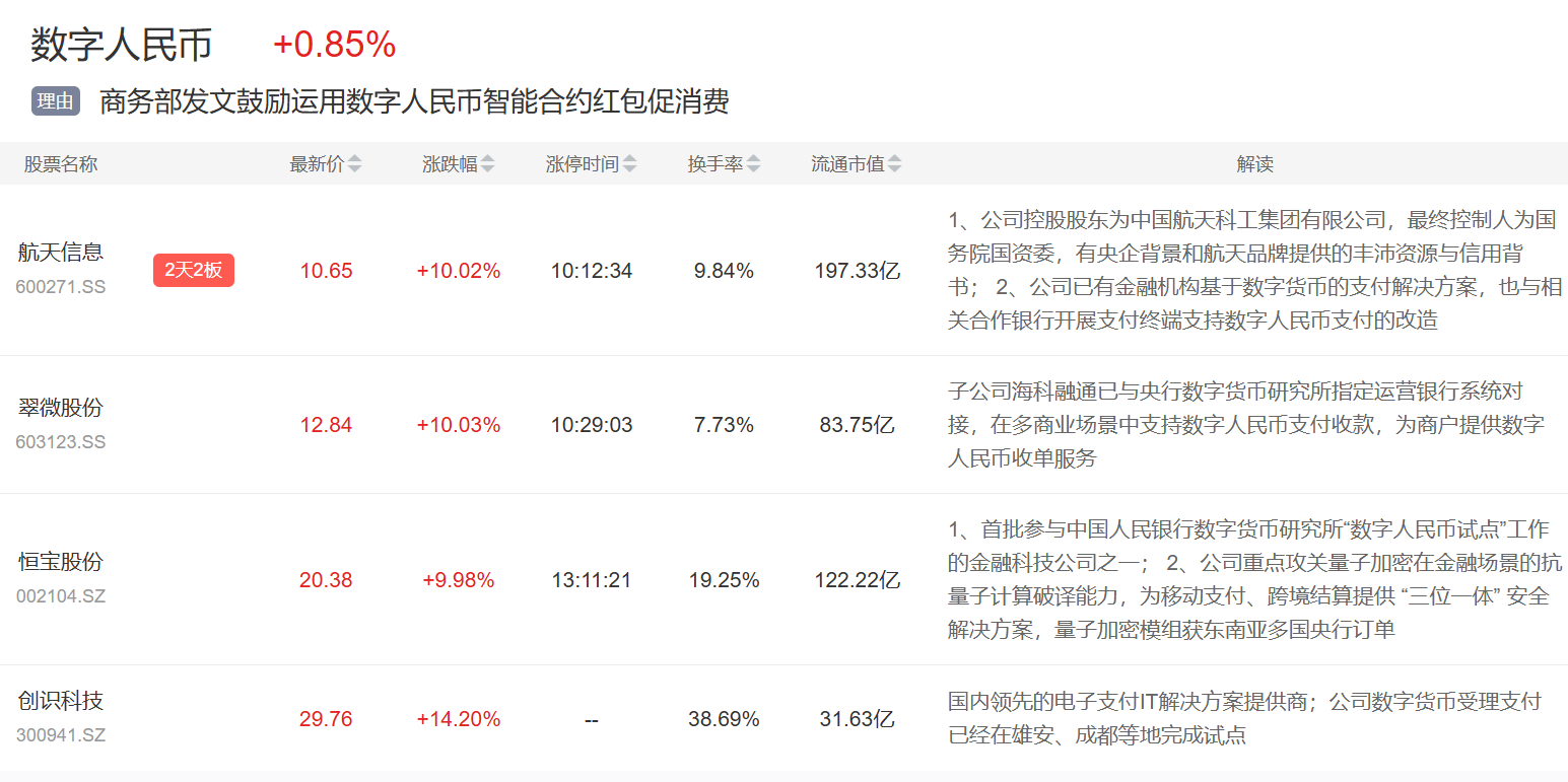 数字人民币概念今日异动,航天信息2连板,翠微股份、恒宝股份等涨停。