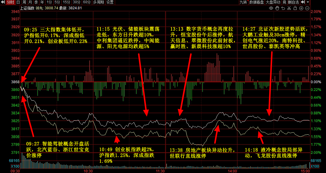 市场全天震荡调整,沪指、深成指均跌超1%,创业板指跌逾2%。零售等消费股逆势走强,永辉超市、安记食品等多股涨停。无人驾驶概念表现活跃,浙江世宝、北汽蓝谷等封板。数字货币概念股拉升,翠微股份、恒宝股份等涨停。下跌方面,光伏板块调整,中利集团跌停;可控核聚变概念下挫,国机重装跌停。个股跌多涨少,沪深京三市下跌个股超4300只,今日成交1.75万亿。