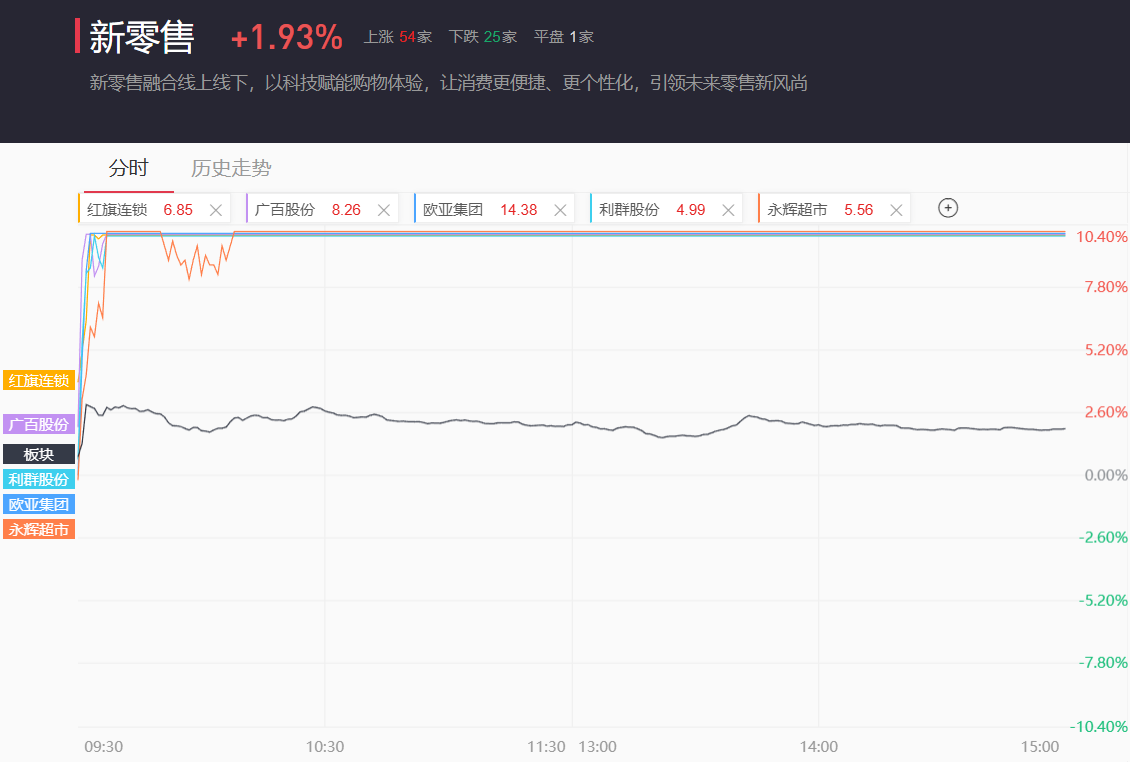 红旗连锁、广百股份、皇氏集团2连板,欧亚集团、利群股份、黑芝麻、永辉超市、中央商场、家家悦、茂业商业、三江购物(炸)先后涨停;