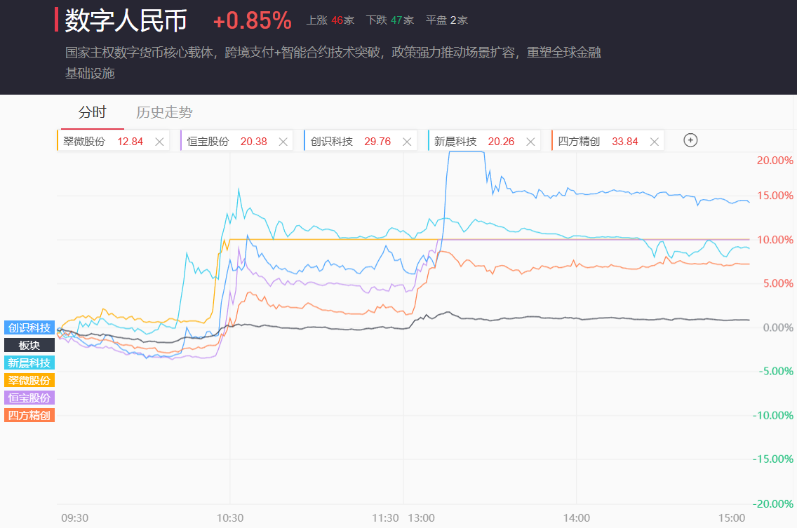 数字人民币板块早盘一度跌超1.5%,此后一度反弹近1.8%,最终收涨0.85%。