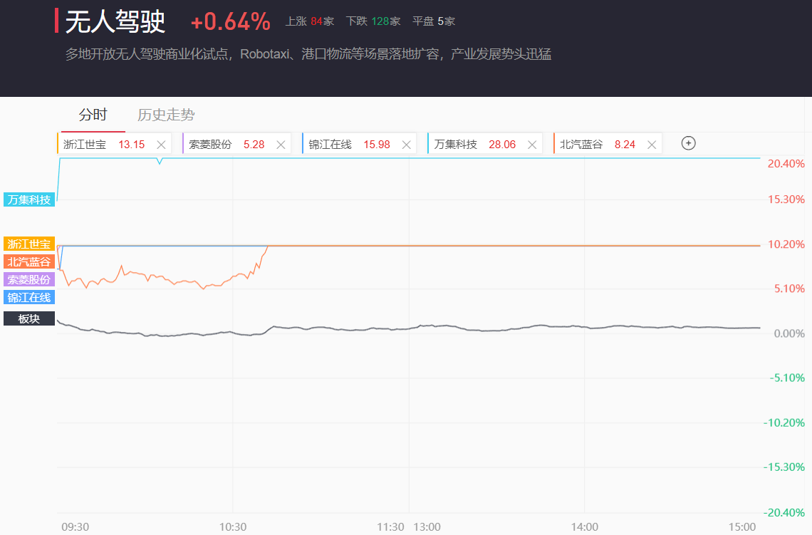 无人驾驶板块整体小幅高开低走,最终收涨0.64%。
