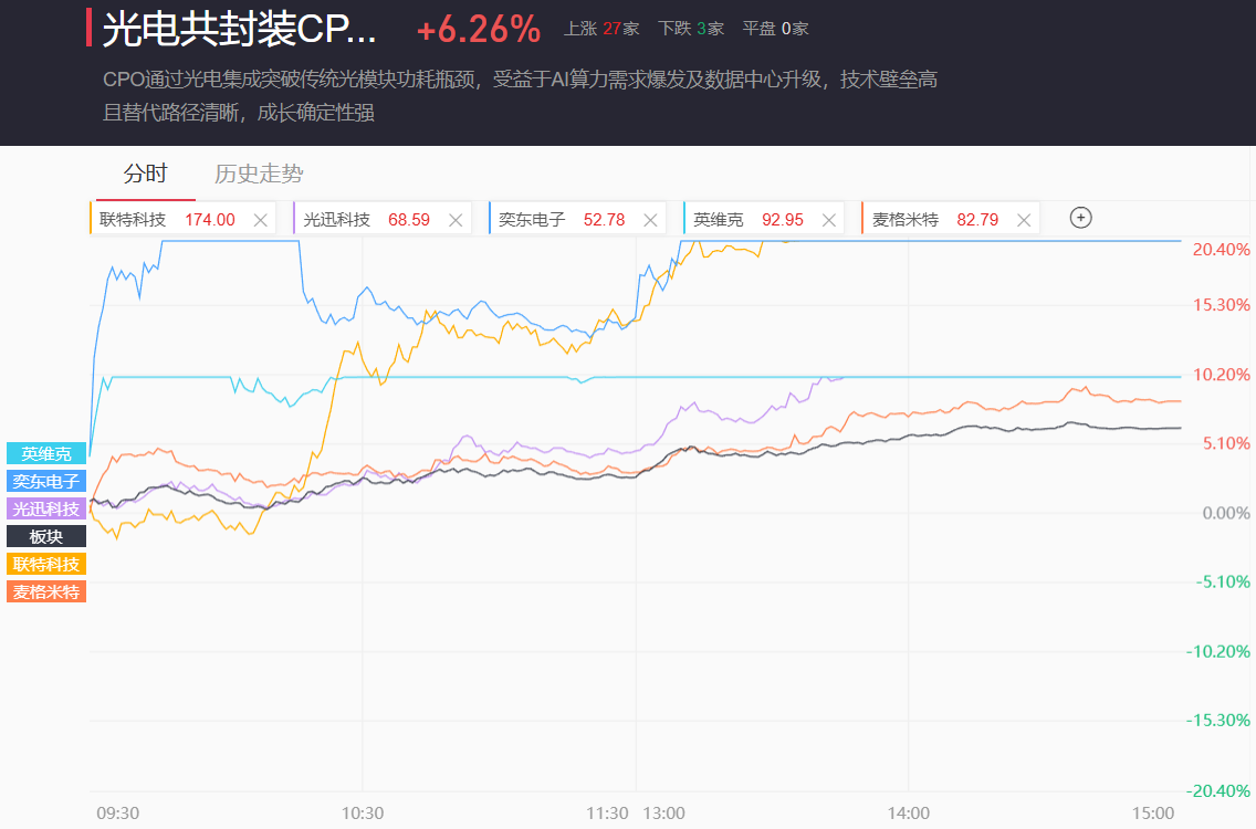 截至收盘,CPO、液冷服务器、高速铜缆分别大涨6.26%、4.79%、3.69%。