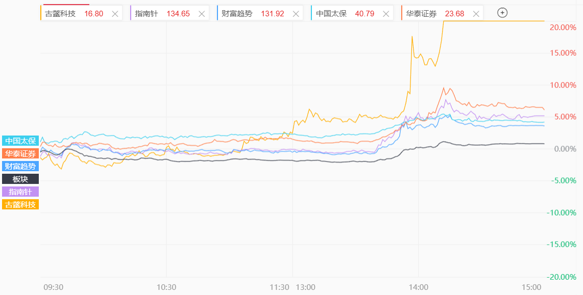 午后,金融科技、保险等大幅反弹,古鳌科技20CM涨停,志晟信息、华泰证券、指南针、合合信息、财富趋势、同花顺、中国太保、中国人寿、中国人保等也都单边走强;