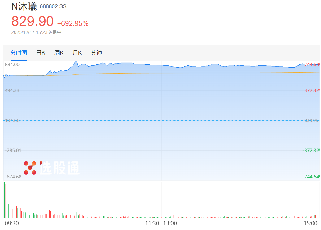 沐曦股份开盘后震荡走强,盘中一度涨超755%,最终收涨近693%。