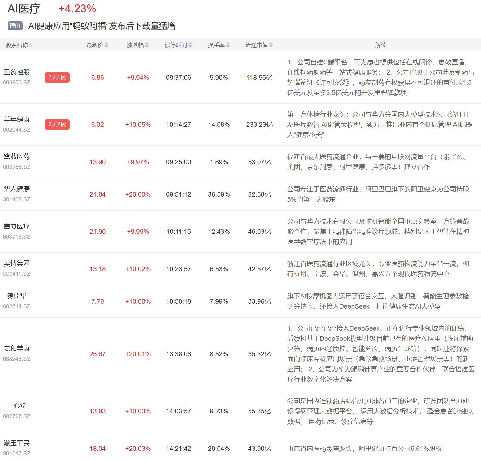 AI医疗概念今日爆发,美年健康2连板,重药控股、鹭燕医药等多股涨停。