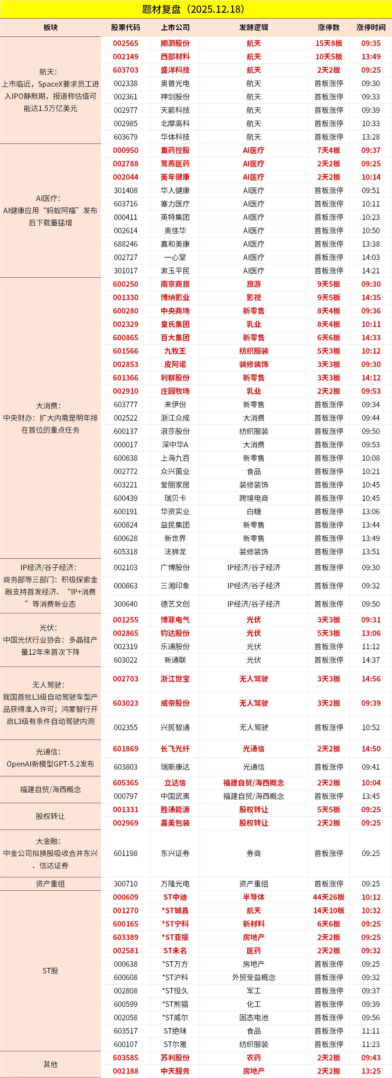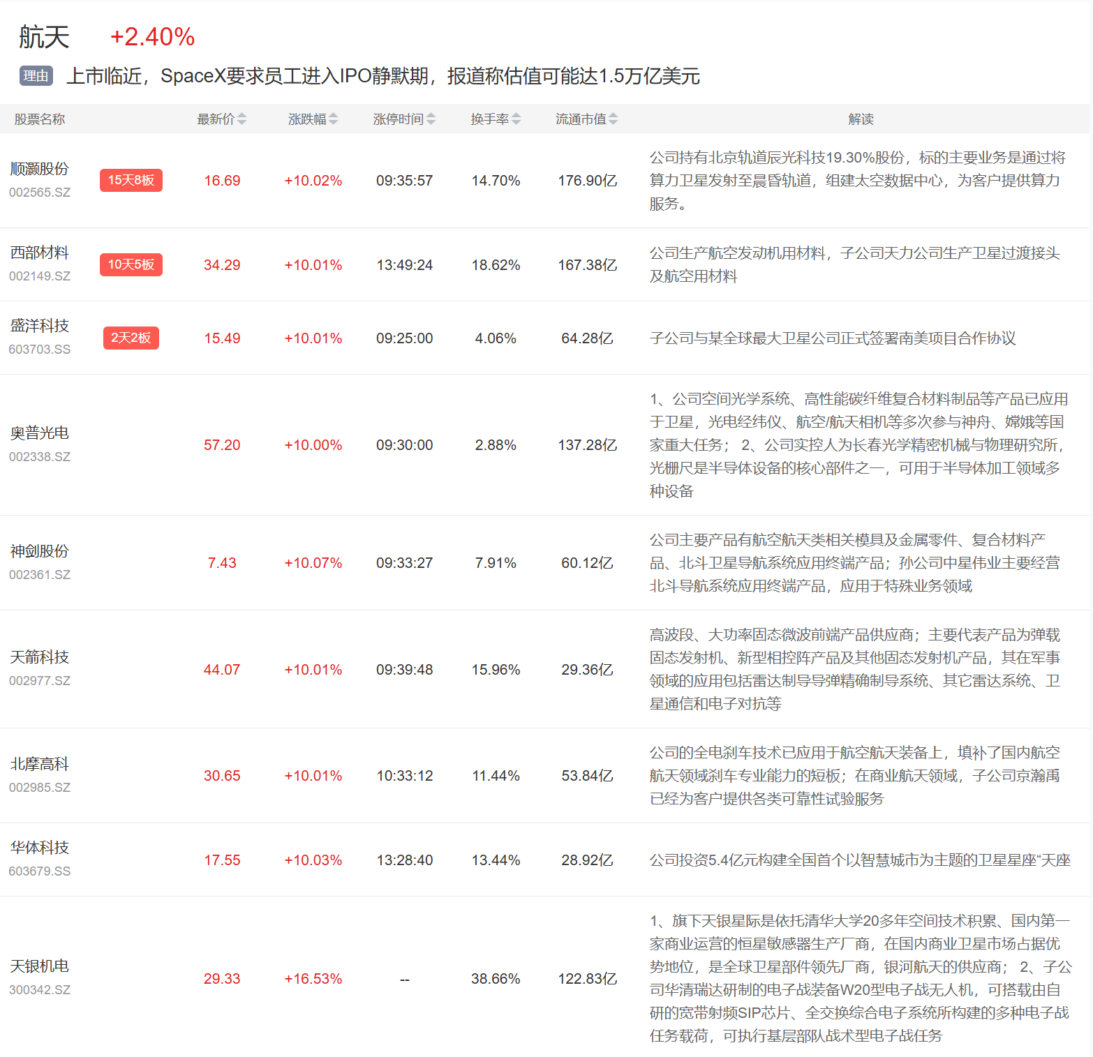 航天板块今日继续强势,盛洋股份2连板,顺灏股份反包,西部材料、奥普光电等涨停。