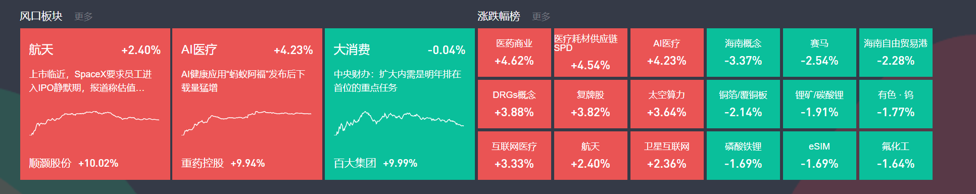 市场全天震荡分化,创业板指跌超2%。AI医疗概念集体走强,华人健康、塞力医疗等涨停。商业航天全线爆发,盛洋科技、天箭科技等涨停。零售、IP经济等消费股拉升,百大集团6连板,上海九百等涨停。下跌方面,算力硬件股下挫,生益科技、景旺电子等跌超5%。个股涨多跌少,沪深京三市近2900股飘红,今日成交1.67万亿。