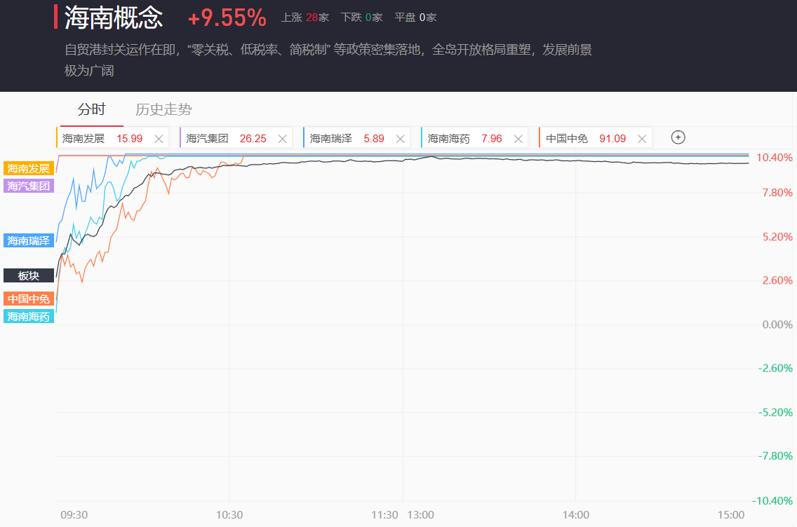 中国中免、海峡股份、凯撒旅业、欣龙控股、海南橡胶、康芝药业(20CM)、海德股份、海南机场、海马汽车、海南高速、海南矿业、京粮控股、新大洲A、罗牛山、神农种业(20CM)、洲际油气、海航控股集体涨停。