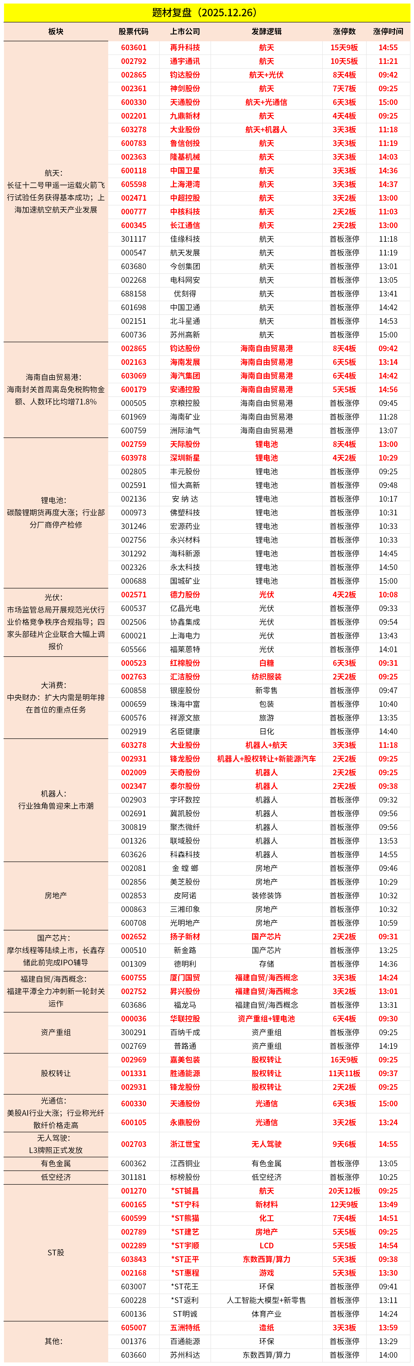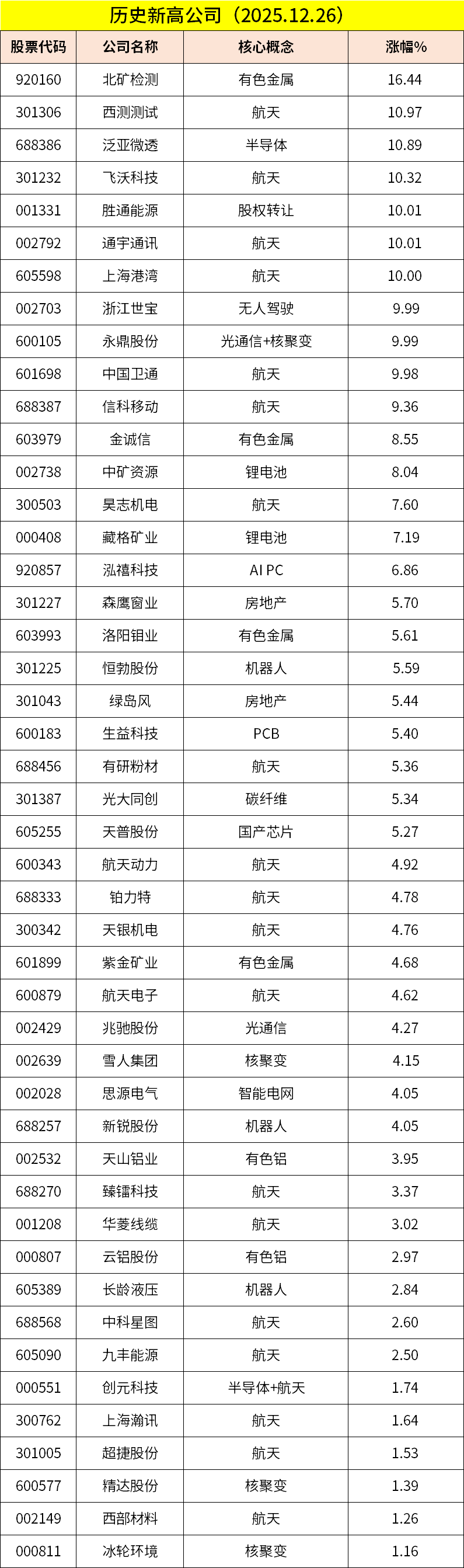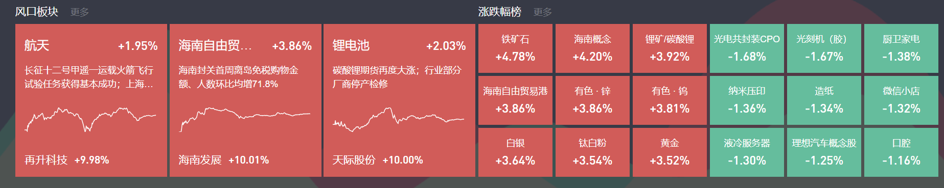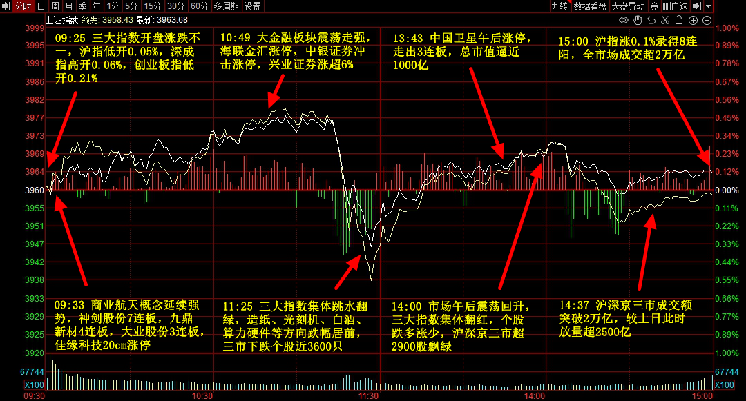 市场全天冲高回落,三大指数小幅上涨,沪指录得8连阳。商业航天概念延续强势,神剑股份7连板,中国卫星、中国卫通等多股涨停。海南自贸区反复活跃,海南矿业、海汽集团等涨停。锂电池板块盘中拉升,丰元股份、永兴材料等涨停。有色板块集体走强,江西铜业、国城矿业等涨停。下跌方面,算力硬件股调整,长光华芯跌超10%。个股跌多涨少,沪深京三市超3400股飘绿,今日成交2.18万亿。