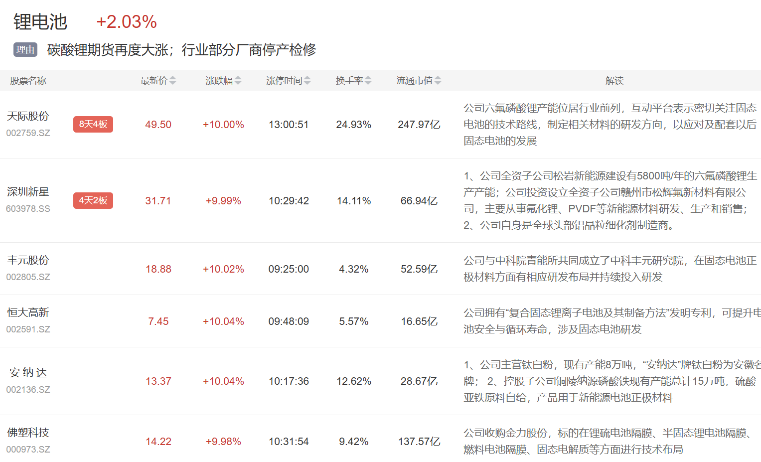 锂电池板块今日强势反弹,天际股份、深圳新星、丰元股份等多股涨停。