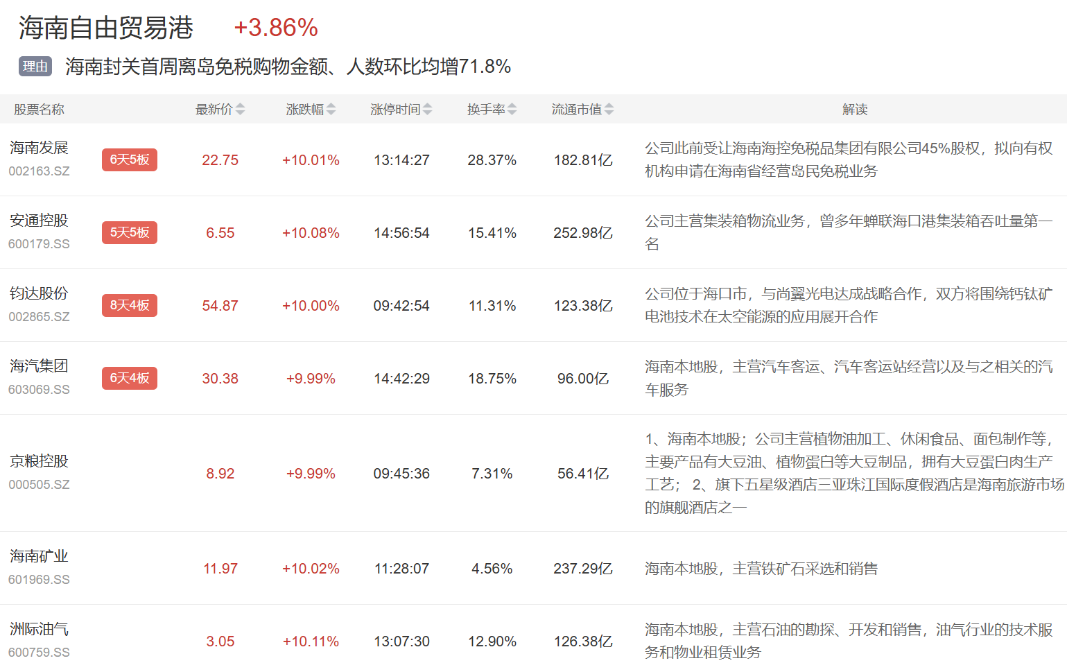海南自贸今日再度表现,安通控股5连板,海南发展、海汽集团等多股涨停。