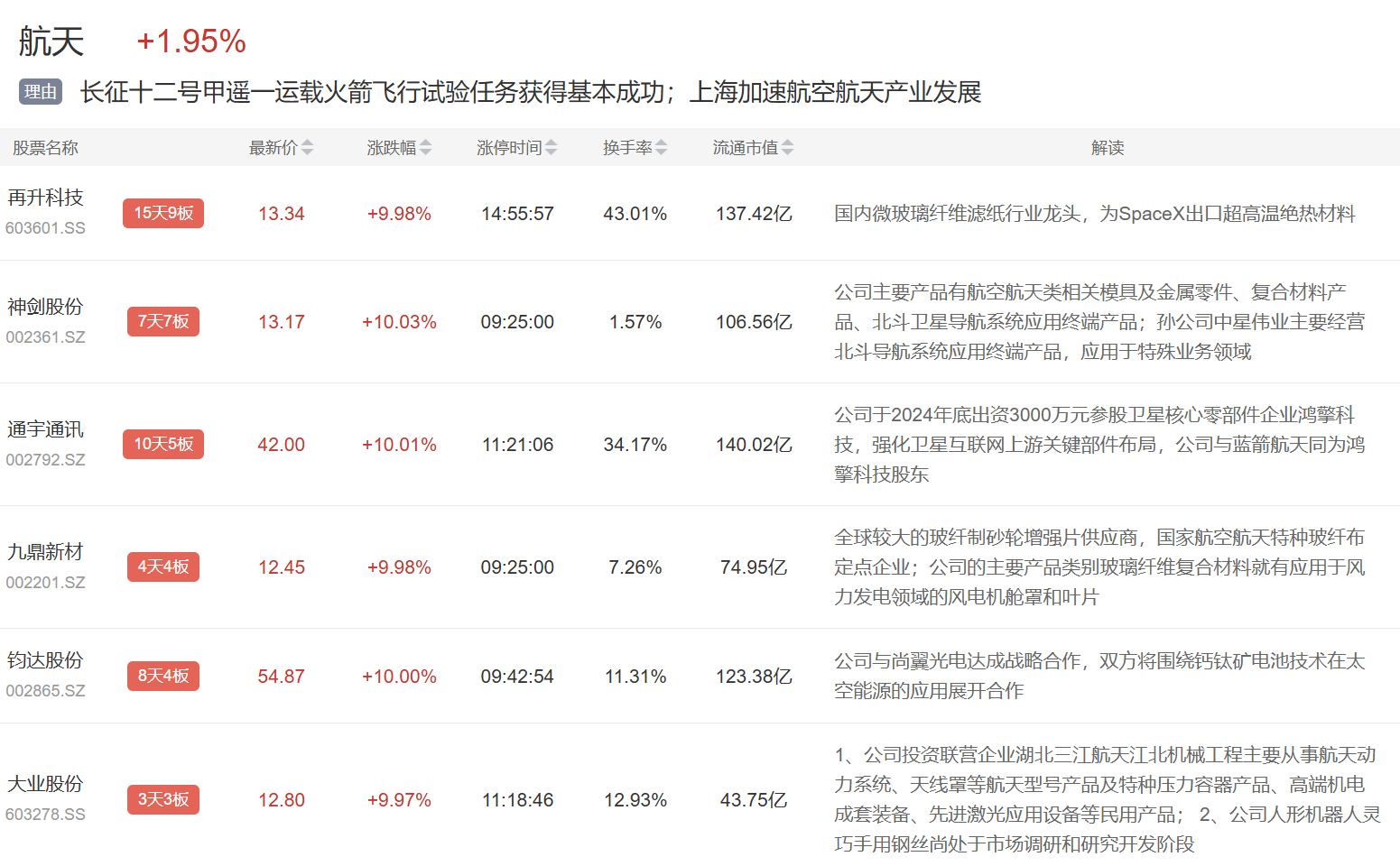 航天板块今日继续强势,再升科技、神剑股份、通宇通讯等多股涨停,中国卫星3连板股价逼近历史新高。