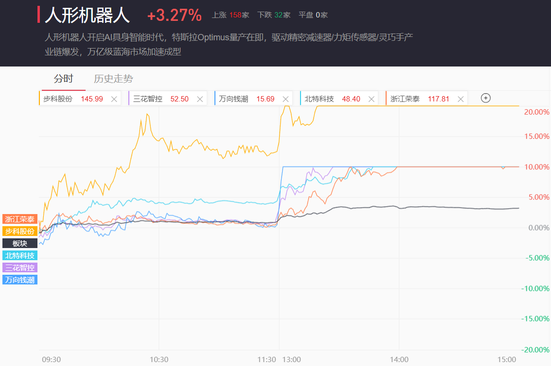 截至收盘,减速器、人形机器人板块分别大涨3.4%、3.27%。
