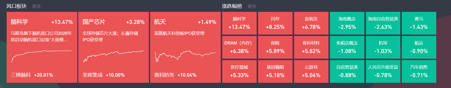 除上述热点外,机器人、人工智能大模型、医药、锂电等均有活跃;跌幅方面,数字人民币、海南自贸等跌幅居前。