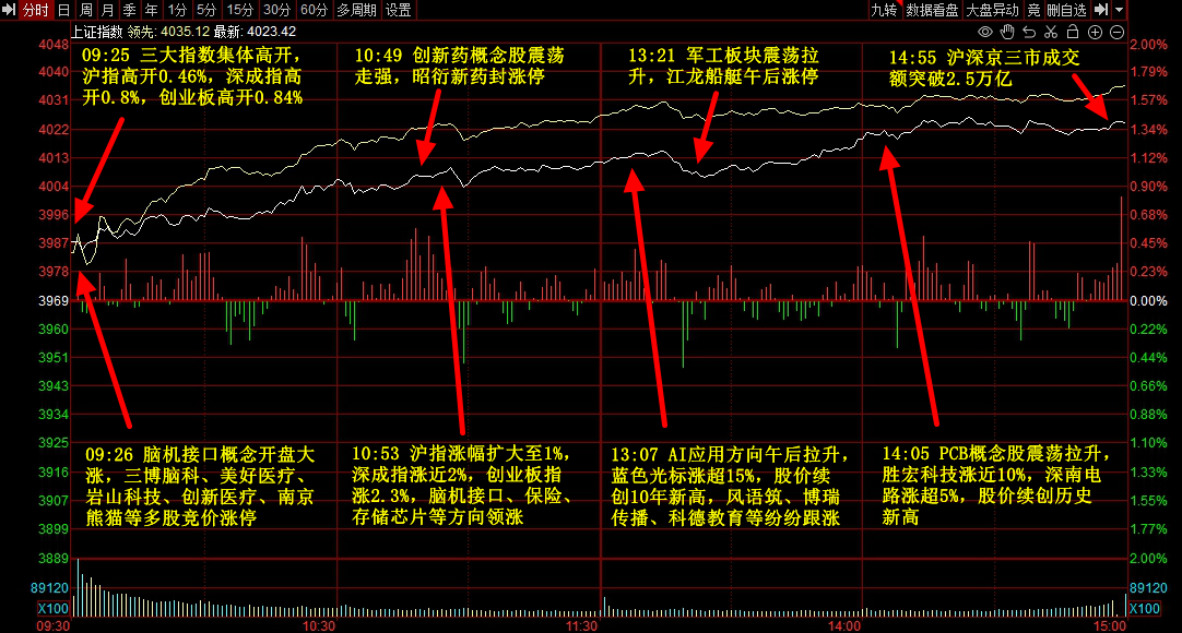 市场全天震荡走强,沪指重返4000点上方,创业板指涨近3%。脑机接口概念掀涨停潮,三博脑科、创新医疗等20余股涨停。半导体板块走强,存储芯片方向领涨,恒烁股份、兆易创新等涨停。AI应用方向拉升,当虹科技、蓝色光标等涨停。保险板块走强,新华保险、中国太保均涨超7%,股价齐创历史新高。个股涨多跌少,沪深京三市超4100股飘红,今日成交2.57万亿。